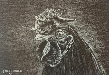 Rooster Head, White Pencil on Black Paper, 5" x 7" , 2024.