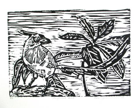 Longtailed Bird, Linoleum block Print, 2025.